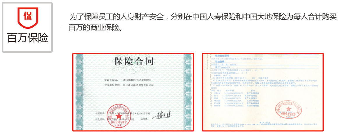 得益于以上幾點(diǎn),藍(lán)軒清潔自成立之初到現(xiàn)在,從無(wú)重大安全事故發(fā)生。在未來(lái),藍(lán)軒清潔也將嚴(yán)格遵循安全作業(yè)守則,打造西南片區(qū)乃至全國(guó)最安全、最專(zhuān)業(yè)的高空作業(yè)隊(duì)伍!