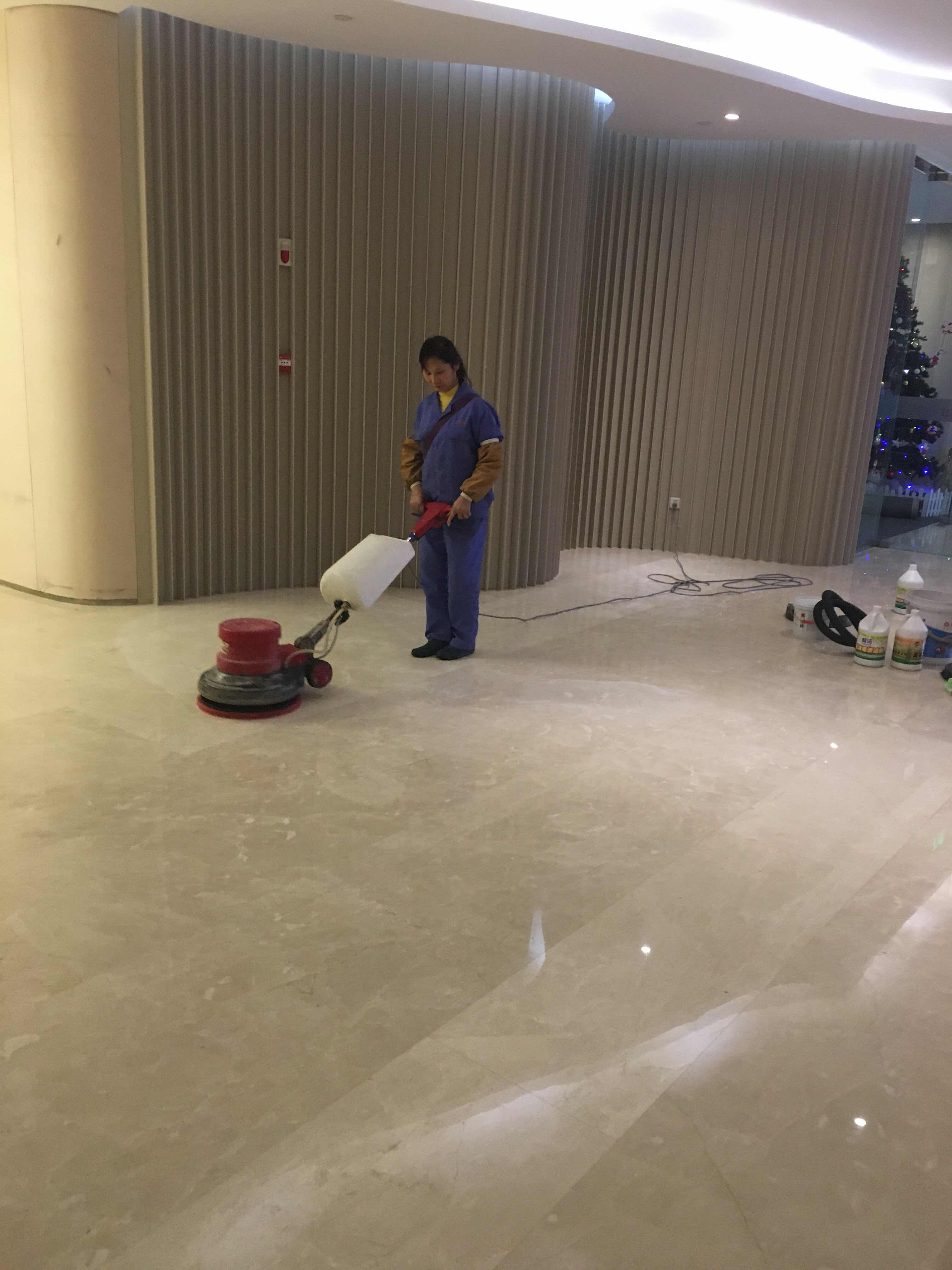 2、晶面硬化處理:石材結(jié)晶硬化處理,第一遍要用加硬做基底,作加硬的時(shí)候,將加硬劑噴在石材上,要將其打磨均勻,以免導(dǎo)致石材表面硬度不一,且導(dǎo)致石材加光后表面的光澤度不均勻;然后再用加光劑進(jìn)行拋光處理,作加光的時(shí)候,必須把加硬劑所處理的面積全部蓋上,這樣才能使石材的每一部分都得到家光處理;用加硬加光的操作方法反復(fù)做5-6遍左右,才能達(dá)到石材結(jié)晶硬化處理的效果。一般石材的光亮度基本上都達(dá)到80度以上;將做完結(jié)晶硬化的石材,全部用一個(gè)新的鋼絲棉墊重新拋光一遍,將施工時(shí)漏掉沒有拋干凈的加光加硬劑清理干凈;